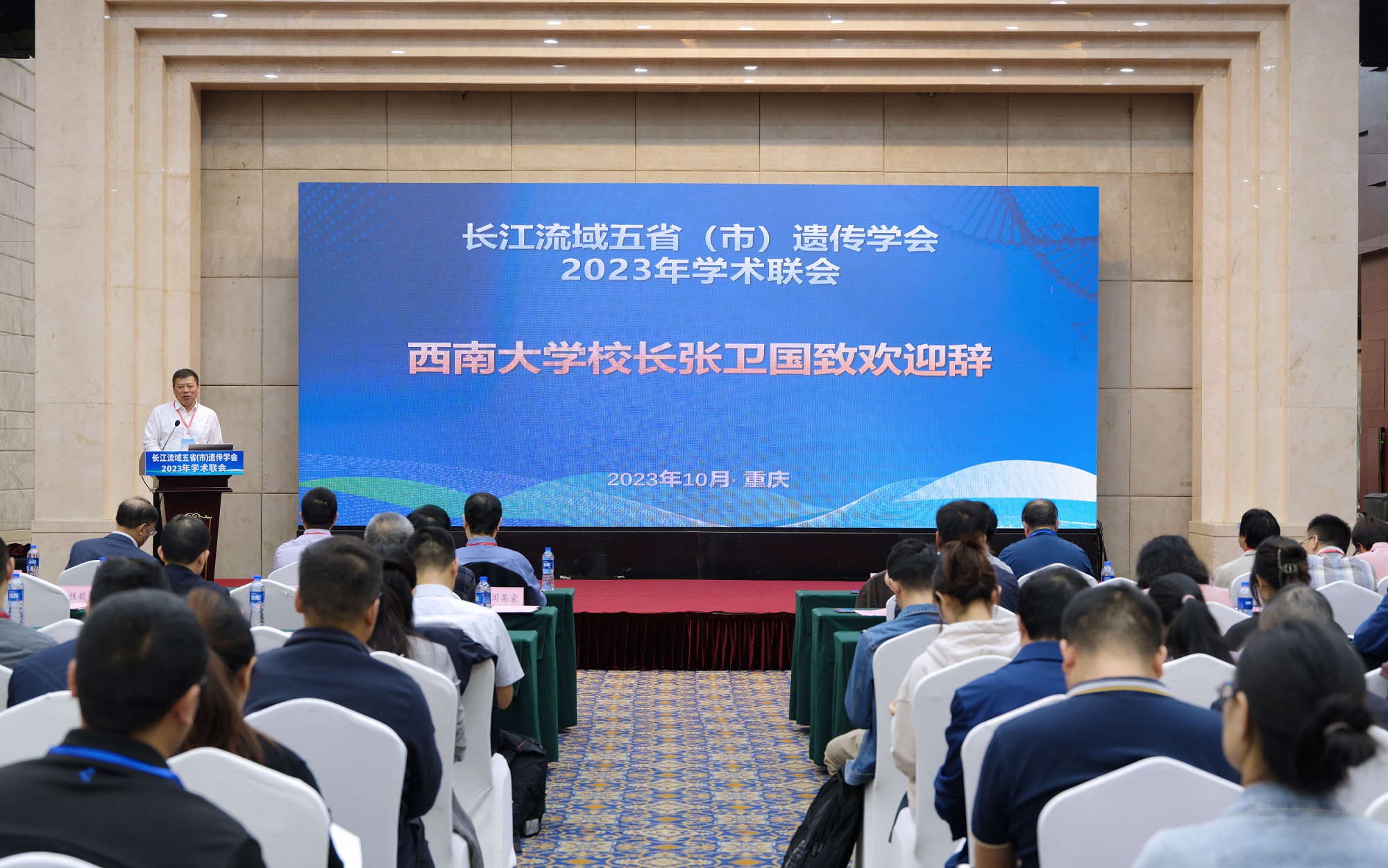 由重庆市遗传学会、安徽省遗传学会、湖北省遗传学会、湖南省遗传学会、江西省遗传学会共同主办的长江流域五省(市)遗传学会 2023 年学术联会于10月11-13日在重庆北碚召开。第十四届全国政协常委、湖南省政协副主席、南华大学校长张灼华出席开幕式。bat365正版唯一官网校长张卫国、重庆市科协二级巡视员牛杰、中国遗传学会理事长薛勇彪先后在开幕式上致辞。来自五省(市)部分高校、科研院所、医院等单位的近300名遗传学科研教学人员和研究生参加本次会议。