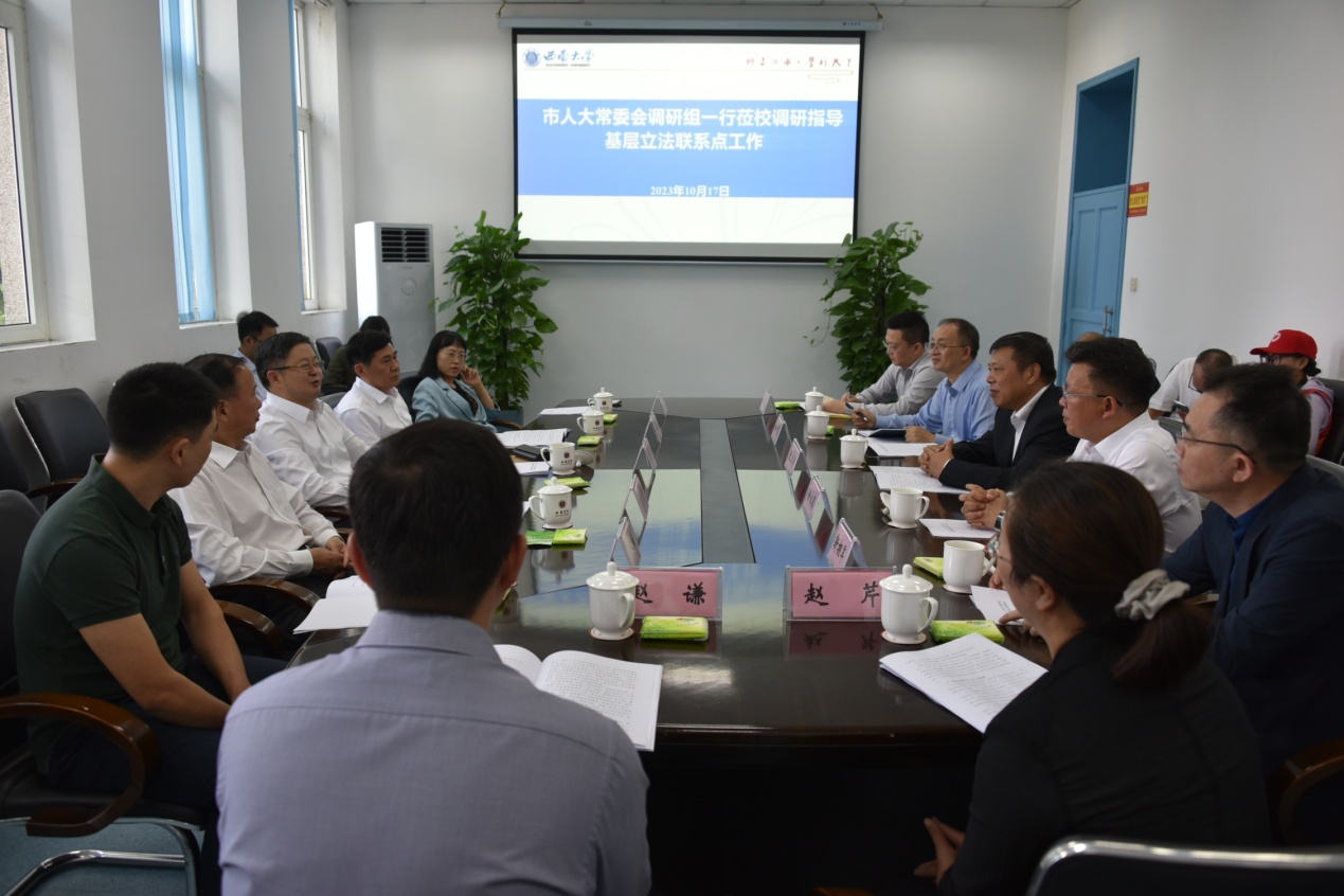 为深入贯彻落实党的二十大精神和2023年全国地方立法工作座谈会精神,10月17日,重庆市人大常委会副主任欧顺清来校调研市人大常委会bat365正版唯一官网国家治理学院基层立法联系点建设及运行情况。市人大常委会副秘书长邓炳国、北碚区人大常委会主任徐永德、bat365正版唯一官网校长张卫国等陪同调研。