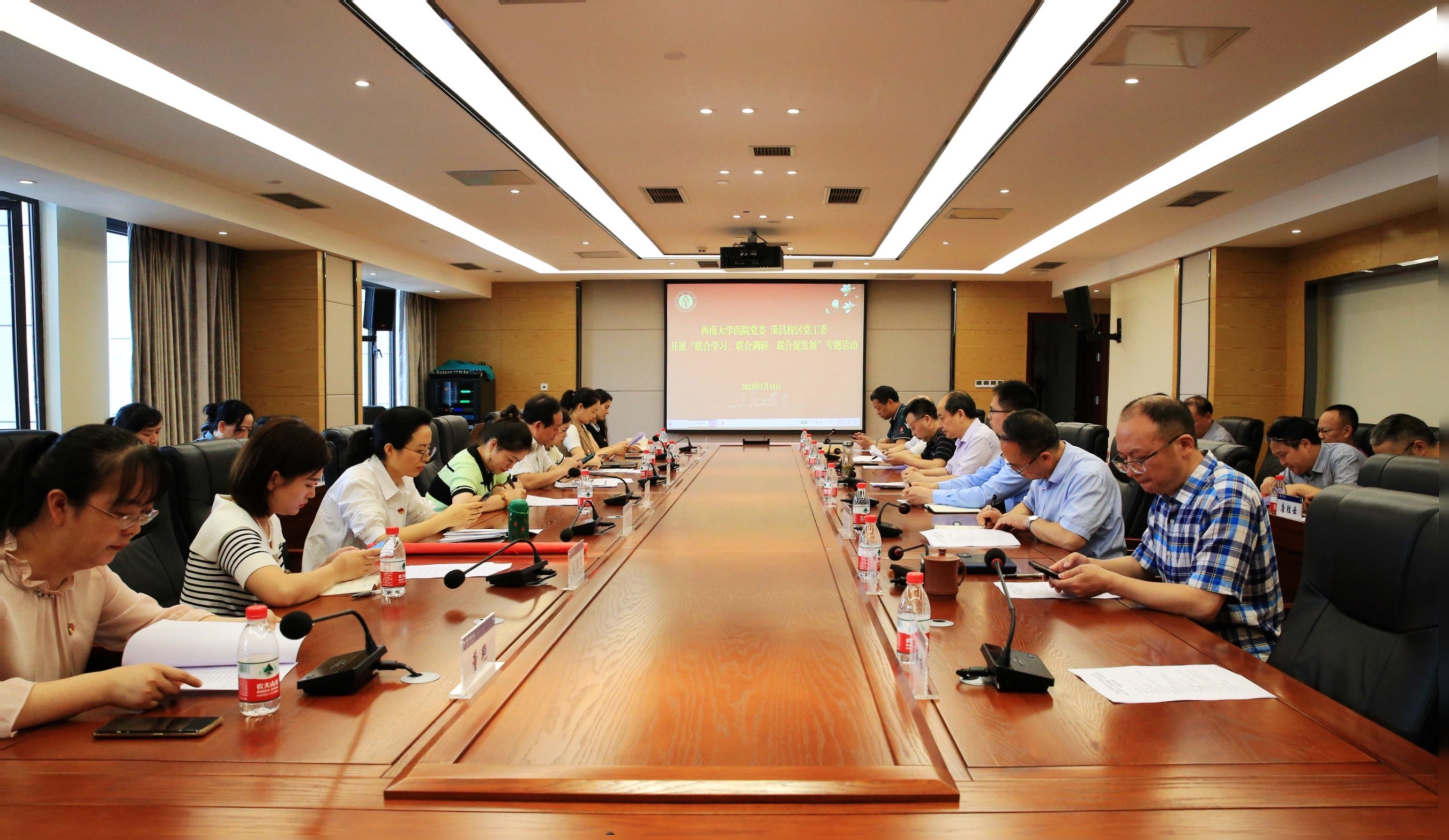为创造性实质推进学习贯彻习近平新时代中国特色社会主义思想主题教育走向深入,5月15日下午,荣昌校区党工委和校医院党委开展“联合学习、联合调研、联合促发展”专题活动,荣昌校区党政班子和校医院党政领导共同出席活动,校区内设管理服务机构负责人及校医院相关行政职能科室负责同志参加,活动由荣昌校区党工委书记周国安主持。