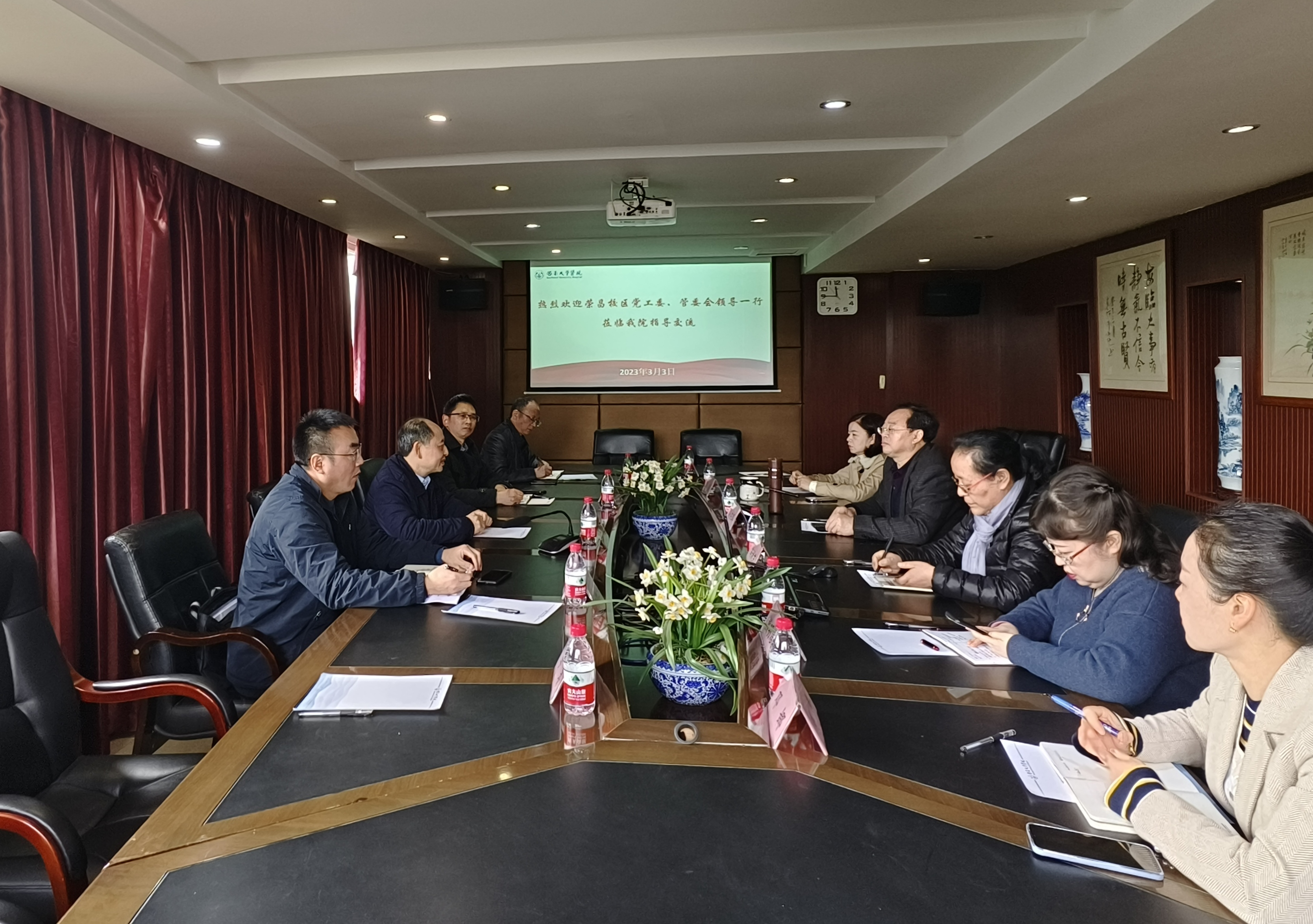 3月3日上午,荣昌校区党工委书记周国安,党工委副书记、纪工委书记穆奎,管委会副主任任元明,综合办公室主任杨德生一行与医院班子成员及相关科室负责人在医院会议室开展座谈,深入交流校区医疗保障工作。