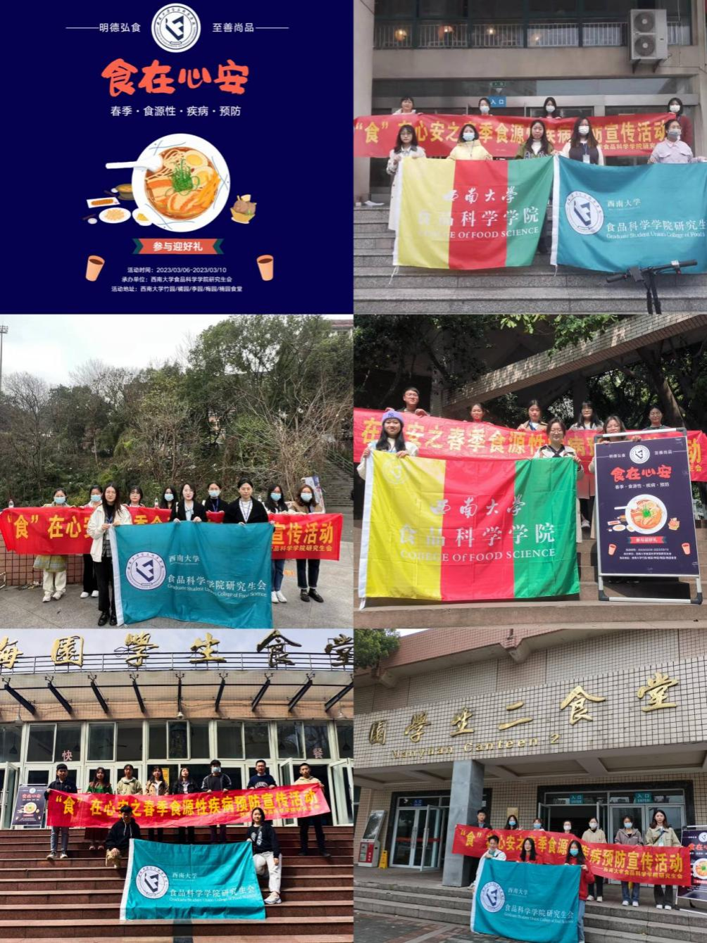 3月6日至3月10日,由食品科学学院研究生会主办,食品科学学院研究生会实践部承办的“‘食’在心安之春季食源性疾病预防宣传”公益活动分别在bat365正版唯一官网竹园、橘园、李园、梅园、楠园五个园区食堂顺利举行。活动参与者由研究生会成员和志愿者共50人组成,活动旨在提高同学们对食品安全的认知和预防意识。