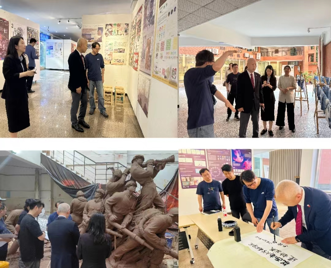 随后,段运冬院长带领李光镐总领事一行考察学院美术馆、扎染教室、雕塑工作室和陶艺创作室。美术馆展览着学院学生课程创作成果,移步换景,段院长对相关作品进行详细介绍,李广镐总领事了解到这是2019级本科视觉传达专业学生毕业设计中期成果时,对其赞叹不已。来到扎染课堂,任课老师正带领学生对扎染课程作业进行染色处理,看到一幅幅蓝色作品,李光镐总领事打趣说到:不愧是青出于蓝而胜于蓝。看到雕塑工作室和陶艺创作室教师们正带领学生以去年缙云山火为主题的集体创作时,对学院师生浓厚的家国情怀和扎实的专业功底赞不绝口。