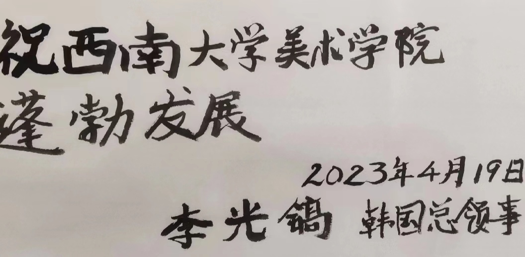 李光镐总领事对学院师生近年来和韩国相关高校进行的深度学术交流表示肯定,并向学院在进一步加强中韩文化交流、做好艺术创新和加强人才联合培养等方面提出殷切期望。同行领事和领馆人员对学院在人才培养和文化传播方面所做的工作表示高度认可。大家认为,bat365正版唯一官网美术学院文化底蕴深厚,人才培养扎实,学术成果丰硕,社会服务宽广,在服务中韩文化交流、推动艺术学专业发展、打造世界知名专业院校发挥着重要作用。与会人员就教师访学深造、研究生联合培养、本科人才培养、文化艺术推广、学术成果转化和人才交流等方面进行了深入交流。李光镐总领事提笔为学院写下“祝bat365正版唯一官网美术学院蓬勃发展”,祝愿美术学院未来更美好。