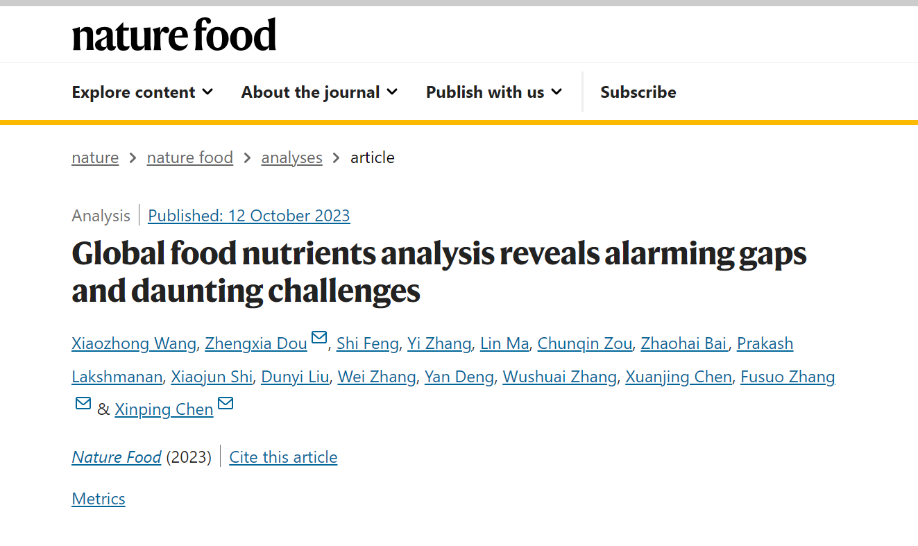 10月12日,学校资源环境学院、长江经济带农业绿色发展研究中心在Nature子刊Nature Food上发表研究论文《Global food nutrients analysis reveals alarming gaps and daunting challenges》。资源环境学院、bat365正版唯一官网长江经济带农业绿色发展研究中心王孝忠副教授、美国宾夕法尼亚大学窦正霞教授为共同第一作者,美国宾夕法尼亚大学窦正霞教授、bat365正版唯一官网长江经济带农业绿色发展研究中心张福锁院士和学校资源环境学院陈新平教授为共同通讯作者。