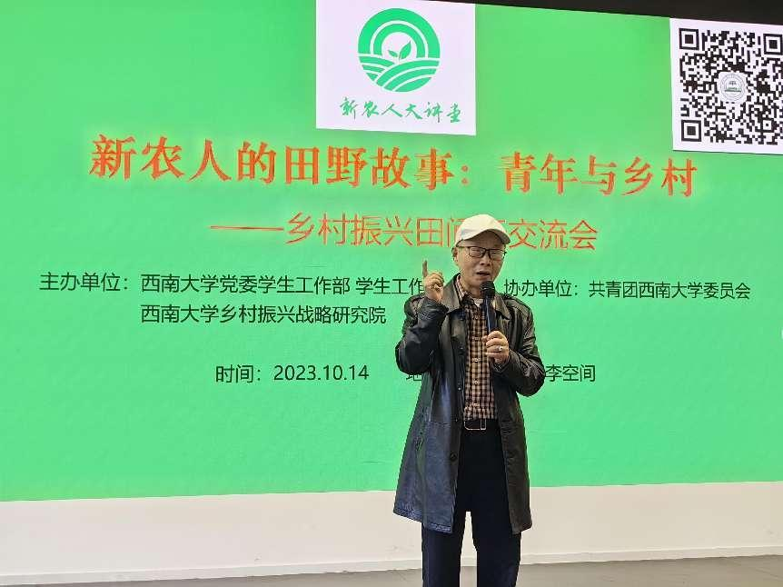 10月14日下午,由党委学生工作部 学生工作处、乡村振兴战略研究院主办,团委协办的“新农人的田野故事—乡村振兴田间行”交流会在青李空间举行。来自“乡村振兴田间行”2023实习生和暑期志愿者,学校涉农学院100余名同学参加交流学习。晏阳初先生侄孙、bat365正版唯一官网中国乡村建设学院名誉院长晏鸿国老先生特邀出席活动。相关部门领导、老师,农学与生物科技学院、教育学部教师代表,大理新生活实践者、四十英尺民宿主理人王丹,中国电影家协会会员、中国电视艺术家协会成员韩君倩导演,巴渝农耕文化陈列馆馆长刘刚受邀出席活动。乡村振兴战略研究院培训中心主任张斌主持交流会。