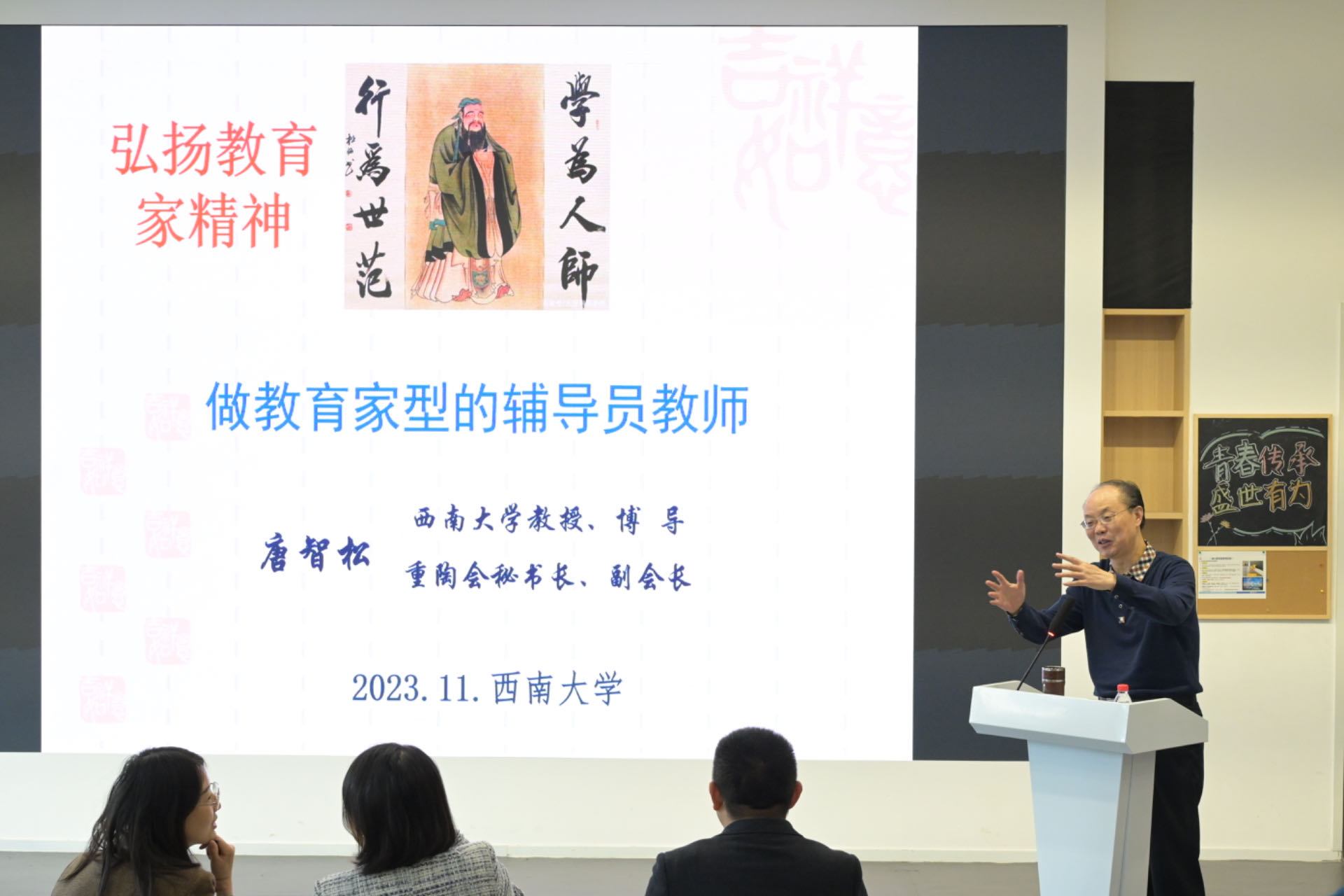 教育学部教育研究院院长、中国陶行知研究会常务理事唐智松教授为“研行班”学员开展专题培训。他以“做教育家型的辅导员教师”为题,着眼认知、支点、路向三个关键词,剖析教育家型辅导员面临的“身份轻”、“角色多”、“任务重”等困境,并从人格特质、专业学识及专业能力三方面为新时代辅导员赋能,勉励在座辅导员们不断攀登教育珠峰。