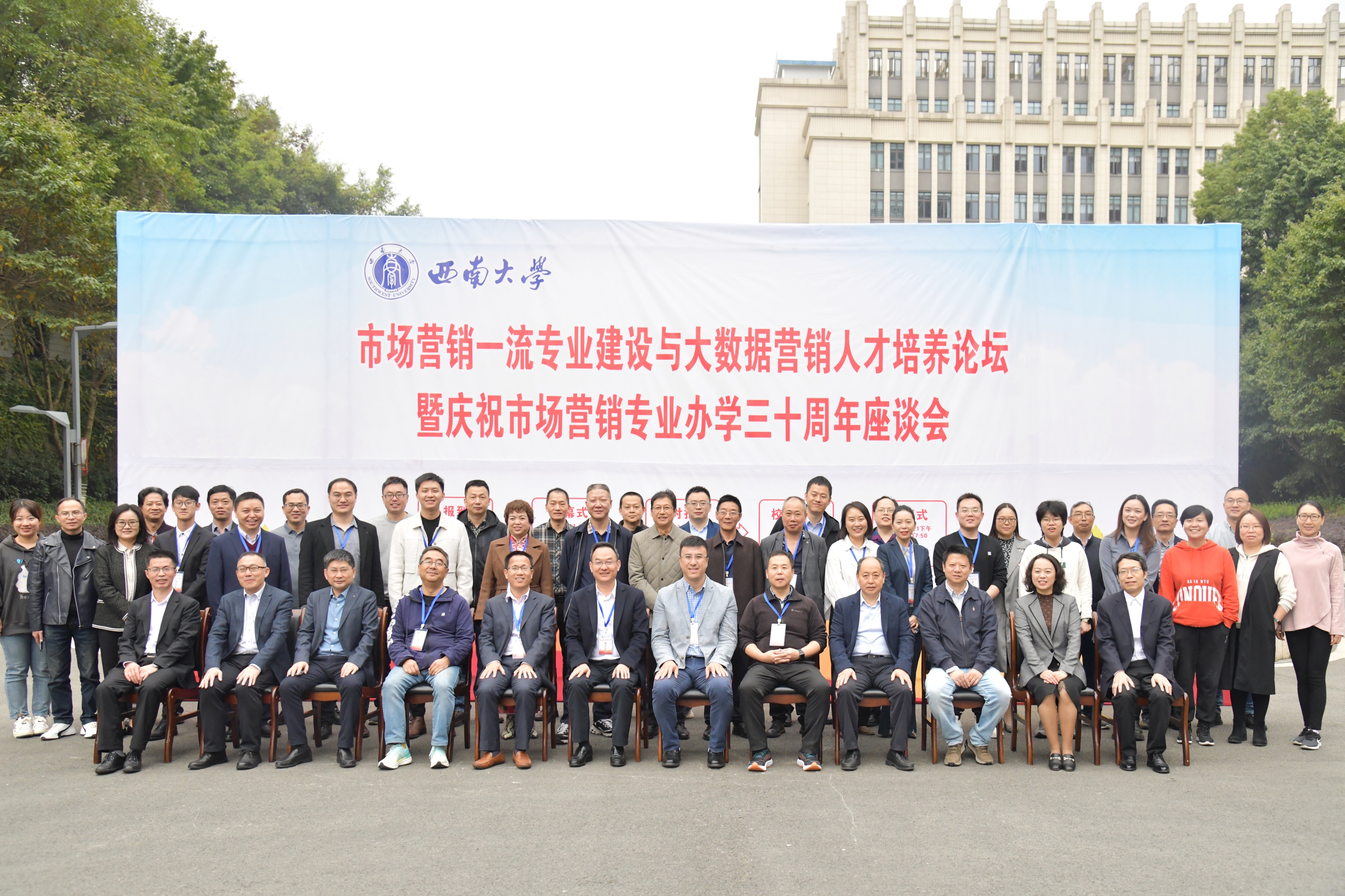 2023年,商贸学院市场营销专业喜迎办学三十周年。值此佳期,为全面总结回顾三十年来的人才培养成绩,开启未来事业发展的新篇章,11月11日,商贸学院举办市场营销一流专业建设与大数据营销人才培养论坛暨庆祝市场营销专业办学三十周年座谈会。学校副校长王志坚,荣昌校区党工委、管委会副相关负责人;中国人民大学、重庆大学、华侨大学、成都工业学院等高校的知名专家学者;市场营销专业各届优秀校友代表,以及商贸学院在校师生共同参加了本次活动。