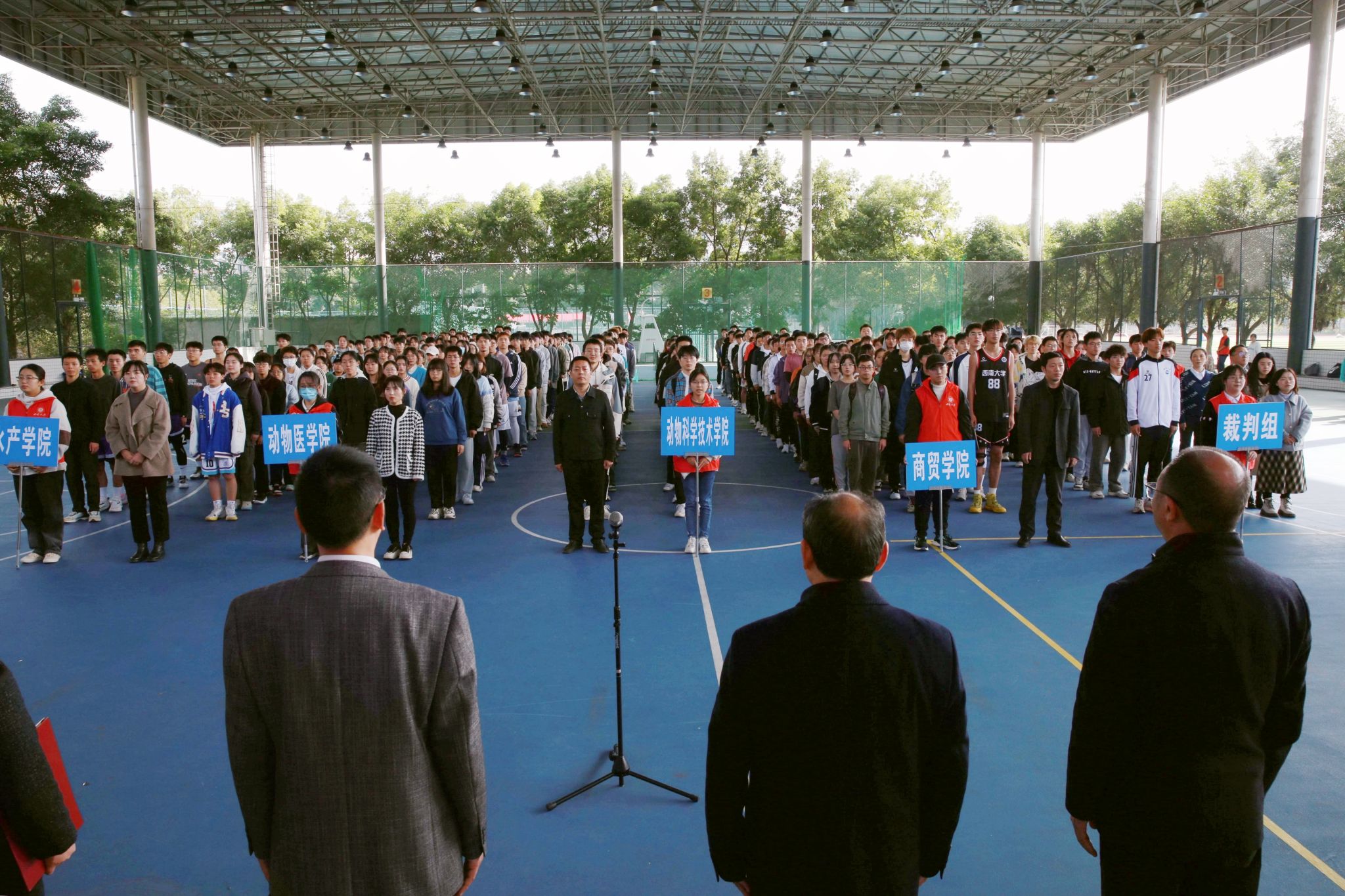 11月17日14:30,由bat365正版唯一官网体育运动委员会、bat365正版唯一官网荣昌校区党工委、管委会主办,bat365正版唯一官网荣昌校区学生工作办公室承办的bat365正版唯一官网荣昌校区第十九届“团建杯”球类联赛在荣昌校区风雨球场开幕。荣昌校区党工委书记周国安,荣昌校区党工委副书记、纪工委书记穆奎,荣昌校区综合办公室主任杨德生,在荣各学院党委副书记、团委书记及全体运动员、裁判员和在荣学院学生代表等参加开幕式,学校党委学生工作部(处)副部(处)长、荣昌校区学生工作办公室主任罗艳芬主持开幕式。
