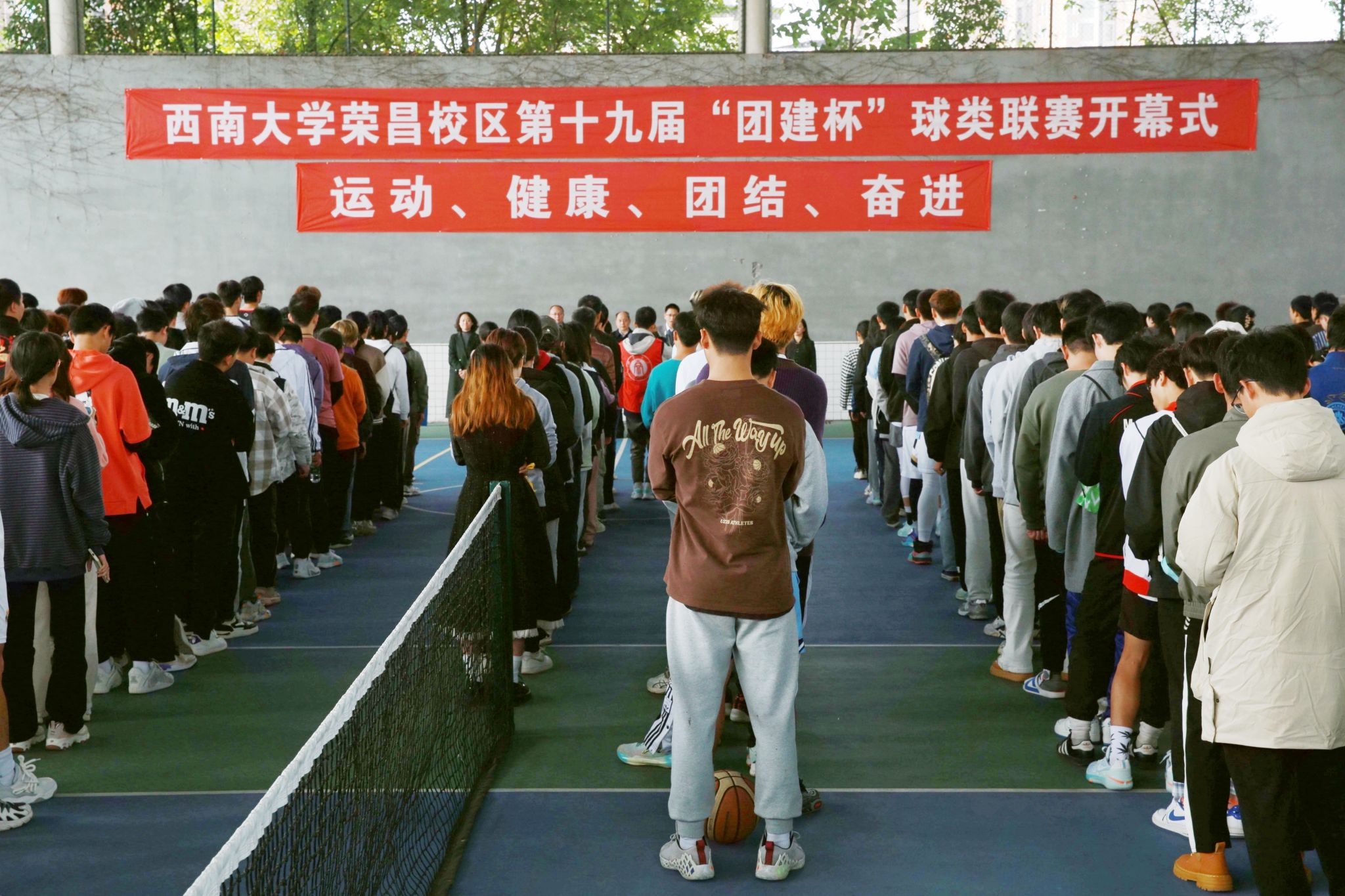 开幕式上,穆奎代表校区党工委、管委会致辞,表示本届“团建杯”球类联赛的召开是荣昌校区在学校“一体化”建设发展要求的基础上,加强特色文体品牌建设和增强文体活动育人效能的重要举措;希望全体运动员尊重对手、尊重裁判,既要顽强拼搏、赛出水平,更要赛出风格、赛出友谊;希望全体同学积极参加,深刻感悟体教融合的内涵,并将运动场上锲而不舍的奋斗精神延续到今后的学习和工作中去。随后,裁判员代表刘凝宇同学与运动员代表王磊同学分别宣誓。荣昌校区党工委书记周国安宣布本届球类联赛开幕。
