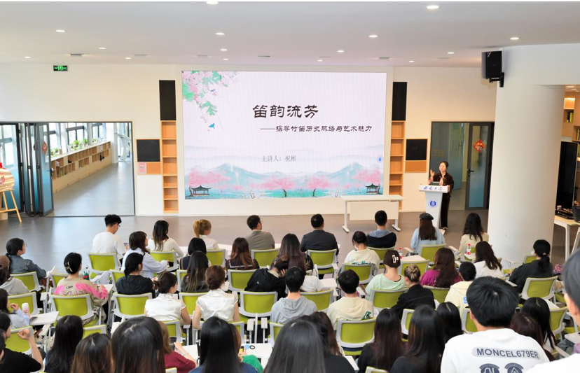 活动第二环节,由学院青年竹笛演奏家、竹笛专业教师祝彬为在场师生带来“笛韵留芳——探寻竹笛与艺术魅力”的精彩分享,此次讲座也是“玉兰花开·国乐绽放”中华优秀传统音乐进园区系列美育活动的第一期。祝老师以古人诗歌中的笛声为引,带大家一起回顾历史,品味经典。现场,一首首竹笛经典作品演绎,时而高亢、时而婉转、时而欢快、时而轻柔,让在场观众听得如痴如醉,仿佛穿越千年,身临其境,与先贤对话,与古人共鸣。祝老师的讲座深入浅出,精彩的表演与诙谐幽默的讲解,使得现场欢笑声与鼓掌声此起彼伏,真是有种“杏花疏影里,吹笛到天明”的畅快感。最后,在现场听众的依依不舍中,本次讲座告一段落。