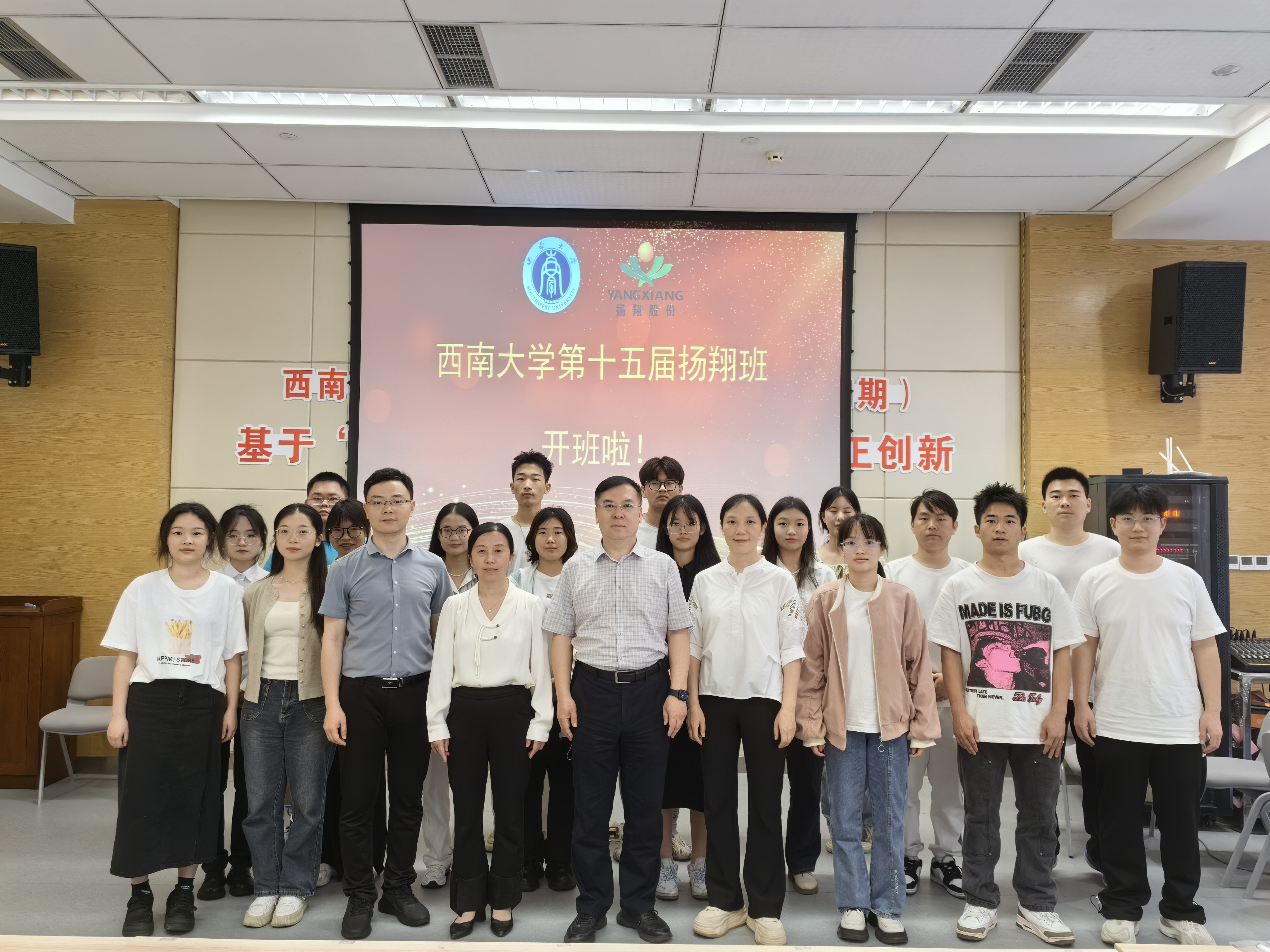 5月10日下午,第十四届扬翔班颁奖典礼暨第十五届扬翔班开班仪式在荣昌校区举行,学校党委学生工作部副部长、学生工作处副处长、荣昌校区学生工作办公室主任罗艳芬、广西扬翔股份有限公司总裁助理兼人力资源总监李曜华、招聘经理龙伟坚,荣昌校区学生工作办公室副主任、扬翔班班主任胡英,广西扬翔股份有限公司招聘专员李大皆出席本次仪式。本次活动由第十四届扬翔班副班长王利元主持。