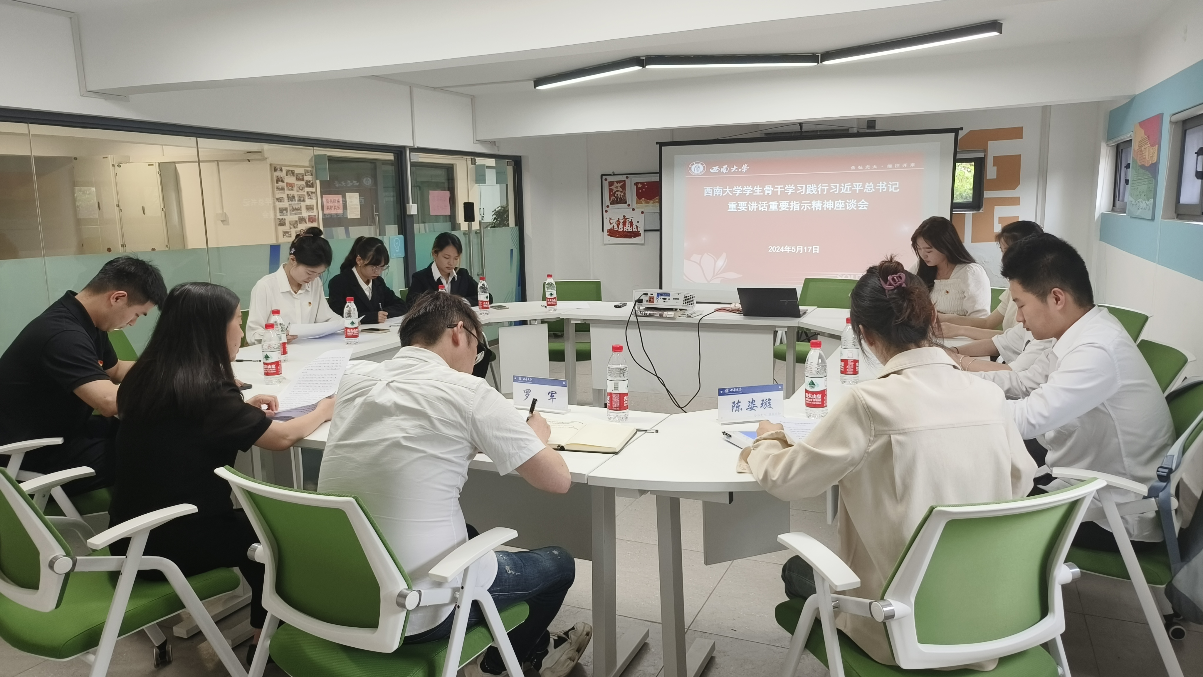 为深入学习习近平总书记视察重庆重要讲话重要指示精神及新时代推动西部大开发座谈会会议精神,贯彻落实习近平总书记对新时代青年重要寄语精神及对学校思政课建设作出的重要指示,不负习近平总书记对广大青年学子的殷切期待,2024年5月17日,bat365正版唯一官网学生骨干学习践行习近平总书记重要讲话重要指示精神座谈会在荣昌校区青樟空间召开,学校党委学生工作部(处)副部(处)长罗军、新闻传媒学院辅导员郭志聪、商贸学院辅导员陈姿璇出席会议,学生党员示范班代表、优秀学生标兵代表、荣昌校区学生骨干代表参加,会议由学校党委学生工作部(处)副部(处)长、荣昌校区学生工作办公室主任罗艳芬主持。