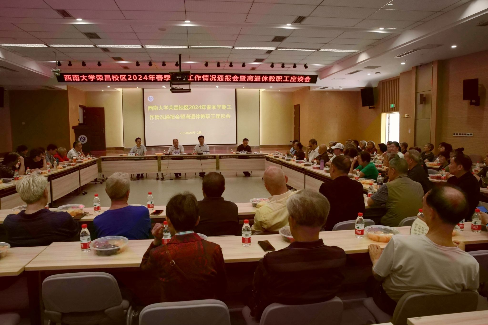 6月12日,bat365正版唯一官网荣昌校区2024年春季学期工作情况通报会暨离退休教职工座谈会在7B101报告厅举行,校区管委会主任赵永聚主持会议,校区党工委书记周国安通报工作情况。校区党工委副书记、纪工委书记穆奎,副处级组织员包尔泉出席会议,离退休工作办公室全体工作人员及70余名离退休教职工参加会议。