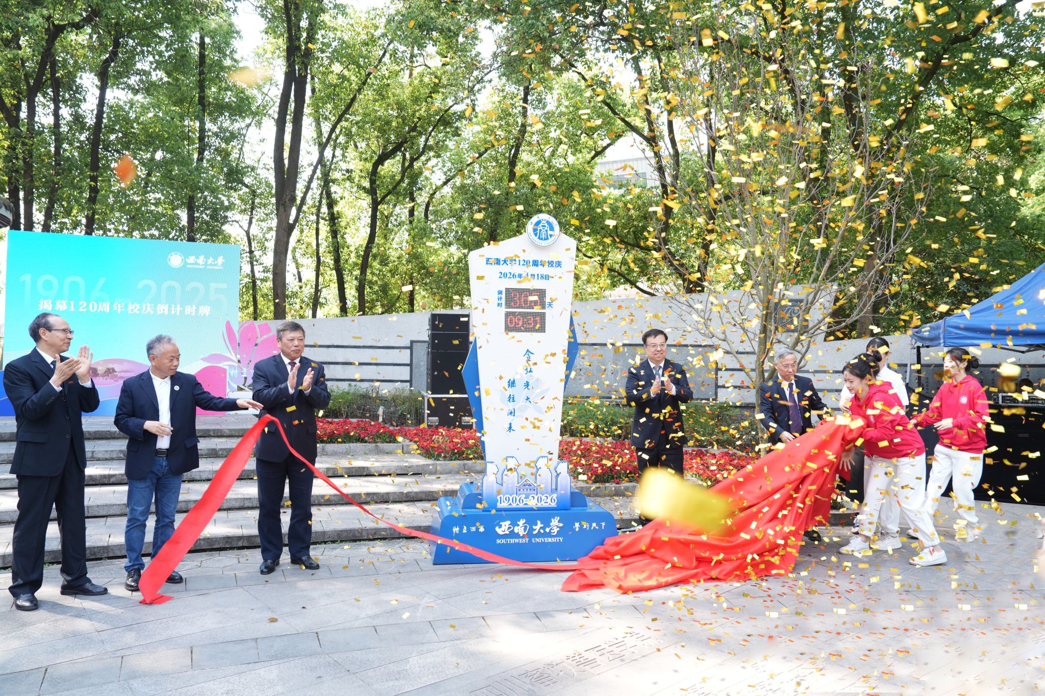 仪式上,张卫国、王进军与校友代表、专家教师代表、离退休老同志代表、学生代表共同揭幕120周年校庆倒计时牌。学校还发布了经过广泛征集师生意见、专家论证和学校研究等程序,确定的校内24处30个亭廊的命名及部分亭廊楹联创作方案。